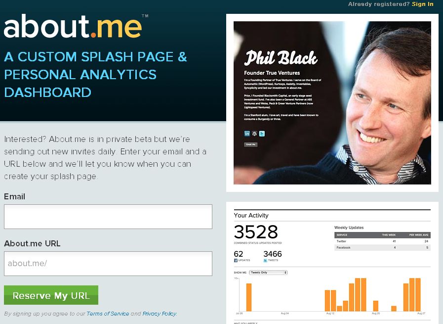 I heard about About.Me through Twitter and the concept is brilliant and simple. About.me is offering a single page splash screen as the first impression that people get when they check you out. They can then navigate to your various other online personalities through links on this page. Via a dashboard, you get to see how much interest there’s been, where they’ve come from and what they clicked on next. Most importantly however is that you get to control that important first impression that people get.