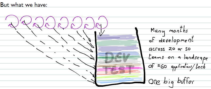 In a purer agile model we would be taking small increments of solution delivery live relatively frequently, something like the picture below. Scrum demands that you deploy all the way to operational usage at the end of each sprint. That’s relatively easy to do at a small tech start-up and more complicated at a big corporate were there are various degrees of role separation between the developers and the deployers. Yes, it is an anti-pattern and all going well, will eventually be cured by a fully automated deployment pipeline – a subject for another post. For now I’ve drawn it as a three sprint batch that is buffered as a release.