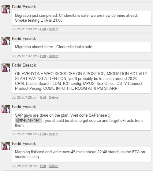 We created a Trello task called “Deployment Commentary” which I used to keep all stakeholders informed as to where we were with the execution. As the coordinator of the deployment I was fully aware of the actual state (because I was monitoring the Trello board and orchestrating the actions) but in the background I was reconciling the critical path tasks against their planned start and end times on the Gantt chart. This meant that at any point in time I knew whether we were running ahead or behind of the planned execution and I knew the number of minutes. As each Critical path task was done, I checked the Gantt, worked out the delay and posted on the commentary so that EVERYONE knew what was going on from a single source. Most people had configured alerting on that task so they would get the update pushed directly to their smartphones or e-mail. It also limited the number of people coming into the Command Center to ask “where we’re at?”.